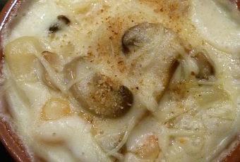 Couper l'oignon en petits dés et le faire revenir dans une sauteuse avec la noix de beurre. Ajouter les champignons. Ajouter ensuite les crevettes et les Saint-Jacques, 2 à 3 minutes plus tard. Laisser chauffer encore quelques minutes, puis noyer le tout dans le vin blanc et porter à ébullition pendant 15 minutes.
