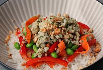 J'ai mixé des pavés de cabillaud (de chez mon meilleur ami "Mr Picard"), avec de la coriandre, du gingembre et de la ciboulette. J'ai ensuite fait cuire le tout à la poêle avec un chouia de lait de coco et de la pâte de curry. Quelques légumes saisis, du riz thaï et des cacahuètes et le tour est joué !