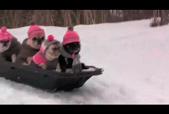 Ce n’est pas pour rien qu’il y a des chiots mignons, tout de rose vêtu, en train de s’amuser dans une luge…