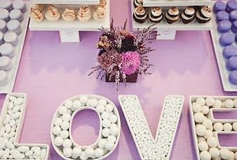 les plats en forme de lettres LOVE sont jolis et originaux pour un candy bar lavande et blanc!