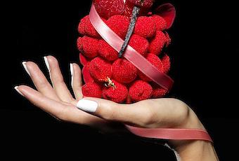 Cette jolie gourmandise est composée d’une meringue française rouge, d’une chantilly à la framboise et d’un crémeux à la vanille sur un biscuit. Le Lioubliou Tibia est paré d’un éventail de chocolat rose et blanc et d’un ruban de satin rose