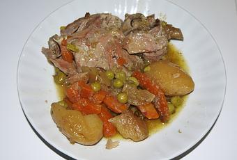 2 cuisses de canard, des navets, des carottes, pommes de terre, une boite de petits pois, un oignon, sel, poivre, laurier, thym,