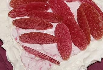 - Dresser la chantilly dans le centre de la pavlova et piquer les tuiles framboise au dessus.