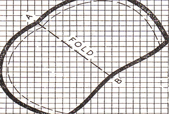 Facile 1 - Reportez le schéma ci-dessous sur votre papier patron. chaque carré fait 1 inch (soit 2,5 cm). Ce schéma est extrait d'une revue féminine des années 40. Vous pouvez utiliser un perroquet ou une règle japonaise pour reproduire les courbes. Par souci de rapidité, je n'ai reproduit qu'une moitié du schéma, et je placerai la ligne du milieu sur la pliure du tissu. Vérifiez bien que la partie du bas corresponde à votre tour de tête, si besoin, augmentez.