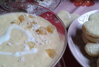 Dégustez le velouté bien frais parsemé de dés de gingembre confit et de noix de coco râpée.