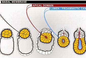 Le premier évènement morphogénétique dû aux cellules pluripotentes des blastocystes de souris comprend la polarisation des cellules épiblastiques et leur arrangement en forme de rosette, menant à la formation d'une cavité.