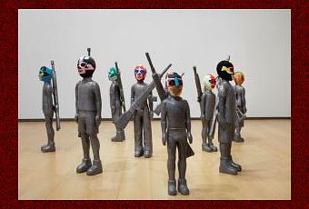 Instalación. Talla en madera de cedro de la figura de niños de 8 a 12 años al tamaño real. Recubierto de laminas de plomo. Máscaras de