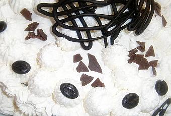 crème ou à l’aide d’une poche à douille cannelée dessiner des picots et décorer avec les grains de café au chocolat, le chocolat en zigzags et quelques copeaux de chocolat.