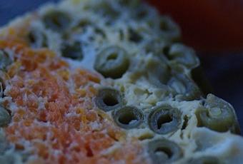 Disposer les petits pois dans le fond du moule préalablement beurré. Verser dessus un peu de préparation aux oeufs. Faire de même avec les carottes, puis les haricots.