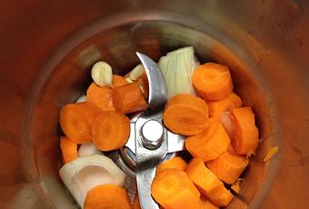 Mettez dans le bol du Cook'in l'oignon coupé en deux, les carottes coupées en tronçons et la gousse d'ail.