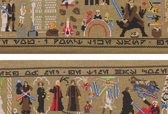 La célèbre broderie de la Tapisserie de Bayeux, décrit les faits relatifs à la conquête normande de l’Angleterre en 1066. Elle détaille les événements clés de cette conquête, notamment la bataille d’Hastings. Ici, l’illustrateur et designer londonien Aled Lewis présente cette vraie broderie impressionnante de l’histoire de Star Wars (épisodes I à VI). Cette pièce brodée à la main de 9 mètres de long est exposée à la Galerie 1988 de Los Angeles et est proposée à la vente au prix de 20.000 dollars. De plus bel effet si vous possedez un château ou une demeure à la décoration médiévale.