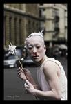Gyohei Zaitsu (cl. Jérôme Delatour / Images de danse)Car l'ange Zaitsu saigne du nez, signe d'un violent choc traumatique, probablement mortel. Sans doute revient-il hanter le lieu même du drame : Paris, place de la République, par une aveuglante après-midi de mai. J'étais là avant l'heure dite pour le photographier, et je ne l'ai pas vu arriver. Ici l'on tourne dans de grosses machines bruyantes, en rond, à l'image du manège installé à proximité, comme par un fait exprès. Gare à celui qui s'aviserait de faire autre chose que de tourner : flâner, se coucher au milieu des voitures, bayer aux corneilles, penser. C'est interdit ! Paris et la République, c'est du sérieux. Gyohei a dû s'y essayer, et voilà ce qui lui est arrivé.