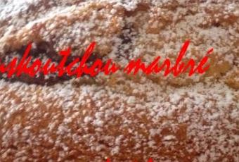ma façon, car le vrai mouskoutchou ne contient pas de chocolat! Bon de temps en temps il faut innover! 6 oeufs 1 verre à eau de sucre cristallisé 1/2 verre d'huile 2 c à soupe de maizéna 1 paquet de levure arôme vanille 2 verres de farine 3 c à soupe de crème fraiche 1/2 tablette de chocolat noir battre les blancs d'oeufs en neige avec 1 pincée de sel et réserver! Battre les jaunes d'oeufs avec le sucre et l'arôme, ajouter l'huile, la maizéna, la
