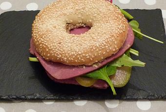 Here is a nice bagel recipe for those who don't have enough time for lunch but still want to eat something good. With some beef cold cuts (left over from your sunday meal for example), a good cream cheese sauce with balsamic vinegar cream and of course pickles to enhance the sweet and savour taste... So yummy!!Ingredients (for 2 persons) -2 sesame bagels -4 thin slices of cold beef roast -6 tablespoons of cream cheese -1 handful of mixed salad -2/3 pickles -2 teaspoons of balsamic vinegar cream -2 teaspoons of minced chives -1 pinch of Cayenne pepper -salt, pepper Heat the bagels in the oven at 330°F for about 5 minutes. Once there are out of the oven, cut them in two and let them cool. Meanwhile prepare the sauce by mixing the cream cheese with the balsamic vinegar cream, the chive, the Cayenne pepper, the salt and pepper. Adjust the seasoning if necessary than spread the sauce on each side of the bagels. Put a slice of roast on each side of the bagels, than put a little bit of salad mix and slices of pickles on a side. Close the bagels and enjoy!!