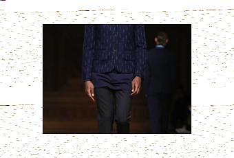 Les cols de chemises se superposent à ceux des cols roulés ou encore l’écharpe apparaît sous forme de croix, apportant à l’allure des détails visuellement impactants. Les couleurs principales sont le bleu, le noir et le blanc, ajoutant quelques gouttes de rouge pour affirmer la silhouette masculine.