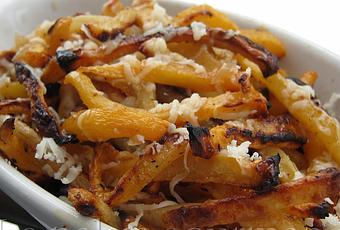 Préchauffer le four à 425 °F. Dans un grand bol, mélanger les navets et la pomme de terre avec l’huile d’olive. Ajouter les épices en vous assurant de bien enrober chaque frite. Disposer les frites une à côté de l’autre sur 2 plaques allant au four, sur un papier parchemin. Cuire les frites environ 30 minutes. Pendant la cuisson des frites, préparer votre sauce. Dans une petite casserole, faire sauter l’échalote dans l’huile d’olive à feu moyen-doux pendant 2 minutes. Ajouter l’ail, puis poursuivre la cuisson 30 secondes.