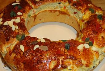 Pour 8 personnes : 500g de farine - 20g de levure de boulanger - 125g de sucre - 2 oeufs - 1/2dl d'huile d'olive gout subtil- 5cl de lait - 4 c à s d'eau de fleur d'oranger - 1 zeste de citron - 1 jaune d'oeuf - 125g de fruits confits coupés en dés- 1 c à s d'arome fleurs d'oranger;
