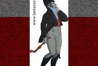 Cette gravure du début du XIXe siècle représente une famille à la mode parisienne d'alors. Elle met en scène un couple et son fils se préparant pour aller au fameux café Frascati avec l'aide de leur servante. Sur ce lieu à la mode voir les articles intitulés Le café Frascati ; Le jardin de Tivoli, le hameau de Chantilly, le café Frascati, le jardin et la cour des Capucines et le pavillon de Hanovre ; et L'incroyable. Il s'agit ou d'un couple de nouveaux riches comme il en existe beaucoup après la Révolution, qui prennent la place de l'aristocratie guillotinée ou émigrée, ou d'un simple jeune couple à la mode. On est cependant dans la caricature. Le visage et la mise de la servante rappellent sans doute leur extraction populaire. On est loin des domestiques en livrée. L'homme est en habit d'incroyable, avec un haut bicorne, une chevelure à cadenettes, une cravate haute, une culotte, des bottes hautes à talon plat, un bâton noueux (voir des exemples de ces tenues notamment dans l'article Exemples de tenues du début du XIXe siècle). La merveilleuse a des cheveux assez courts sur le devant, coiffés en chignon pour le reste, une robe à gorge profonde, à l'antique, avec une longue traîne. Sa servante lui passe son châle (sur ce vêtement voir l'article Le schall (châle) et l'écharpe). Son garçon, habillé en jockey anglais comme c'est alors la mode, lui tend son sac. Il a une tenue similaire à celui de l'enfant de la gravure de l'article intitulé Belles et beaux. Sur l'anglomanie d'alors voir l'article intitulé Anglomanie, partie 1 : dans la seconde moitié du XVIIIe siècle et dans les premières années du XIXe. La merveilleuse se contemple avec ravissement dans le miroir d'une psyché, le nouveau meuble de bon goût (on commence à savoir fabriquer alors de grands miroirs).