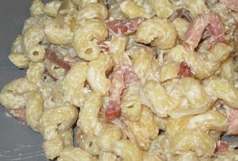 Egoutter les pâtes et mélanger avec les lardons, l'oignon, la ricotta.