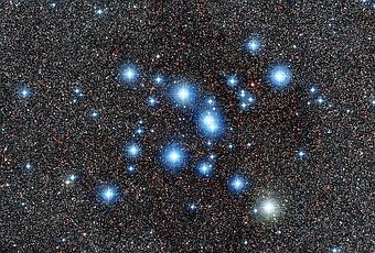 Essaim de jeunes étoiles Messier 7 ; on distingue à l’arrière-plan des milliers d’étoiles de la Voie LactéePortrait grand-champ de l’amas ouvert Messier 7 visible à l’œil nu prés de la queue de la constellation du Scorpion.Quand vient la fin du printemps et que la constellation du Scorpion monte dans le ciel boréal, nombreux sont les astronomes amateurs et autres curieux à pointer jumelles, lunettes et/ou télescopes en direction de la queue de cette constellation du zodiaque pour observer prés de son dard, le semis d’étoiles de Messier 7. « La nébuleuse suivant la queue du Scorpion » ainsi que l’aurait décrite le célèbre astronome Claude Ptolémée à qui est attribuée la découverte. Nul besoin d’un instrument pour le distinguer dans cette région du ciel proche du bulbe galactique.Distant de 800 années-lumière, M 7 (NGC 6475) ou « amas de Ptolémée » est une fratrie de quelques dizaines d’étoiles jeunes, toutes âgées d’environ 200 millions d’années. Bref, un amas ouvert au même titre que les « Pléiades » (Messier 45), l’un des plus célèbres qui soit visible à l’œil nu.À l’instar de ses congénères, l’amas M 7 est appelé à essaimer ses étoiles dans le corps de la galaxie, au fil de ses révolutions. Quant aux étoiles les plus chaudes et massives que l’on peut distinguer sur cette image capturée par la caméra grand-champ du télescope MPG/ESO de 2,2 mètres installé à l’Observatoire de La Silla au Chili, elles exploseront violemment (supernova) bien avant leurs consœurs plus discrètes.