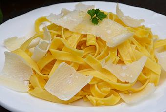 Déposer les tagliatelles dans les assiettes, arroser d’un bon filet d’huile d’olive à la truffe.