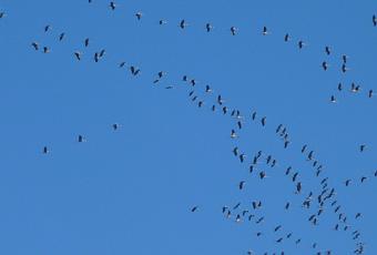 La grue cendrée vit et se reproduit en Europe du Nord, sur un vaste territoire allant de l’Allemagne à la Sibérie. Lorsque le froid devient trop vif, et donc que la nourriture se raréfie, la grue migre vers des territoires plus doux où l’assiette sera mieux remplie. C’est ainsi qu’entre la fin de l’été et le milieu de l’automne (les dates varient selon les années), des grues quittent en hordes bruyantes le grand nord devenu hostile pour des régions plus méridionales : certaines prennent la voie orientale, et rejoignent l’Ethiopie et le Soudan en passant par l’Europe centrale. Les autres prennent la voie occidentale et rejoignent l’est et le centre de la France, mais aussi les Landes (il y en avait plus de 17000 dans la réserve d’Arzujanx en décembre dernier) et surtout l’Espagne. Ce sont les grues de la voie occidentale que nous voyons et entendons deux fois par an.