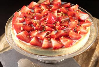 Pendant ce temps réalisez votre nappage maison.Faites trempez la gélatine dans de l'eau froide.Faites cuire le sucre et l'eau afin d'obtenir un sirop. (attention à ne pas faire caraméliser) Ajoutez la gélatine ramollie et essorée.Laissez refroidir.Garnissez votre fond de tarte de crème pâtissière. (délayer la crème pâtissière avant)Coupez vos fraises en deux et disposez les (comme vous voulez) sur la tarte.Parsemez d'éclats de pistaches torréfiées.A l'aide d'un pinceau, nappez la tarte avec votre nappage maison.Servir frais.