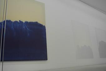 La boule, j’imagine qu’elle est un soleil rouge, lui-même tombé ici, et non pas à l’horizon de son couchant, ici en haut des marches qu’il faut descendre pour assister à la catastrophe. Le ciel nous tombe sur la tête et il n’est plus temps de rigoler. Sur les murs, cependant, semblent tenir les trois paysages d’un bleu profond, sorte de ligne de faîte d’une forêt qui aurait absorbé toute la couleur du ciel qui s’y serait vidé, infiltré, y creusant des rigoles, justement, des veines carbonifères. Et je pense à la fin du monde racontée par Manuela Draeger dans Onze rêves de suie : l’image se fige, qui reste pour voir ?