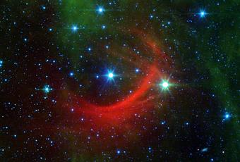 Visible à l’oeil nu dans la constellation circumpolaire de Cassiopée, l’étoile Kappa Cassiopeia est une supergéante très brillante (classe spectrale B) à l’instar des célèbres Rigel (constellation d’Orion) ou Regulus (constellation du Lion). Distante d’environ 4 000 années-lumière de notre système solaire, l’étoile massive affiche une vélocité hors du commun, largement supérieure à celle de notre Soleil lequel d’ailleurs ne produit pas vraiment d’effets dicibles sur le milieu interstellaire. Avec une vitesse de déplacement estimée à 4 millions kilomètres par heure (1 100 km/s.)., Kappa Cassiopeiae (désignée HD 2905) bouscule la matière effilochée dans son environnement. Comme on peut le découvrir sur l’image capturée par Spitzer, son mouvement rapide dessine une couronne de gaz à sa proue. Une empreinte de l’onde de choc distante de 4 années-lumière (soit autant que la distance qui sépare le Soleil de sa plus proche voisine, Proxima Centauri). Une sorte d’auréole sous l’emprise du rayonnement de l’étoile et de son champ magnétique. Composé de gaz et de poussières en déshérence dans la galaxie, le nuage est observable grâce à la sensibilité au rayonnement infrarouge du télescope spatial. Aucune chance de l’appréhender dans le visible au foyer d’une lunette ou d’un télescope. Si l’étoile ralentissait, le nuage serait moins comprimé et échapperait davantage à l’observation dans ces longueurs d’onde.