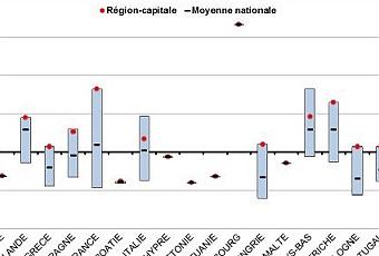 Parmi les 41 régions dépassant le seuil de 125%, onze régions se situaient en Allemagne, cinq aux Pays-Bas ainsi qu’en Autriche, trois en Belgique, en Italie ainsi qu’au Royaume-Uni, deux en Espagne ainsi qu’en Finlande, une région en République tchèque, au Danemark, en Irlande, en France, en Slovaquie et en Suède, ainsi qu’au Grand-Duché de Luxembourg considéré comme une seule région.