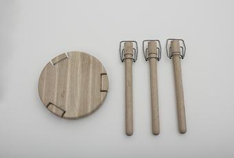 Réalisé entièrement en frêne, le designer propose une assise concave pour le confort et trois pieds à fixer par un système largement inspiré des systèmes fermeture métallique de bouteille.