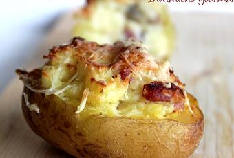 - placez les pommes de terre évidées dans un plat à gratin et garnissez-les de farce