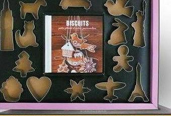 Je viens de recevoir des éditions Marabout un coffret vraiment sympa pour faire des petits biscuits, contenant 1 livre de 26 recettes de biscuits, sablés et cookies et 14 emporte pièces en métal.
