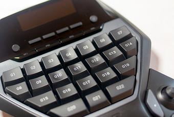 De part le positionnement de son joystick, j’aurais tendance à dire que le G13 s’adresse exclusivement à votre main gauche, cependant rien n’empêche une utilisation avec la main droite, ça risque juste d’être un peu compliqué d’utiliser le joystick avec le petit doigt… pourquoi pas. La forme de « vague » du G13 rend son utilisation très confortable, j’ai toujours la paume de ma main gauche sur ce revêtement noir adhérent qui s’avère rigide bien que caoutchouteux. Comme souvent chez Logitech, la finition est top et l’ajustement est au poil. J’ai un léger problème de feeling avec les deux touches (grises) situées à proximité du stick : elles font un « clic métallique » et elles ont l’air d’avoir (l’une et l’autre) des distances d’activation différentes.