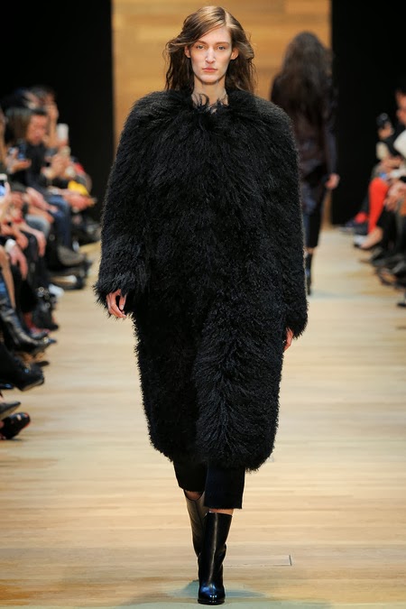 Et puis, le noir profond qui s'éveille avec des jeux de matières et de formes entre plissés asymétriques, soie enrubannée et agneau de Mongolie hippie chic.