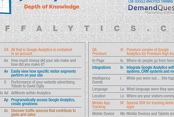 Jeff Sauer a publié un guide Google Analytics sous la forme d’un tableau périodique, dans lequel les éléments sont regroupés par type, les produits, les métriques, les rapports et les fonctionnalités. Pour ceux d’entre vous qui utilisent GA depuis un certain temps, ce tableau périodique Google Analytics vous rafraîchira la mémoire. Vous pourriez vous rendre compte de tous les fonctions, paramètres ou rapports qui sont disponibles et que vous n’utilisez peut-être pas et donc, passer à côté de précieuses données sur les visiteurs ou les clients de votre site web. Quelque que soit votre expertise sur GA, un petit rappel de choses n’a jamais fait mal, non ?