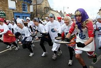 Bien sur, au départ, Shrove Tuesday est une fête religieuse, mais elle est devenue pancake Day depuis le 15 siècle. Dans la ville d’Olney, dans le Buckinghamshire, on organise des courses, les participants galopent en tenant une poêle à frire et en y faisant sauter un pancake. La tradition prétend que c’est en mémoire d’une paroissienne, qui était tellement en retard pour la messe, un beau matin de 1445, qu’elle est arrivée en courant et avec sa poêle à la main. Pour corser la chose, les participants aujourd’hui doivent aussi être plus ou moins déguisés, avec tablier, jupon, foulard (y compris les hommes). C’est charmant.