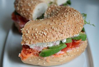 - Ajouter sur l'une des moitiés de bagel, les morceaux d'avocat, les carottes râpées, les tomates. Ajouter un trait de citron. Terminer par un peu de salade et refermer le bagel.