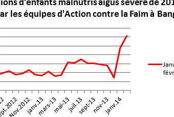 En janvier et février 2014, les équipes d’Action contre la Faim constatent le triplement des admissions d’enfants malnutris dans les programmes nutritionnels de l’association par rapport aux mêmes mois les années précédentes. Plus de 1200 enfants ont été admis en traitement en février, et 1000 en janvier. A la même période les années précédentes, ces programmes accueillaient autour de 350 enfants. La couverture des programmes d’ACF s’est améliorée au long des années, mais une telle augmentation est le signe d’une dégradation forte de la situation nutritionnelle pour les plus pauvres.