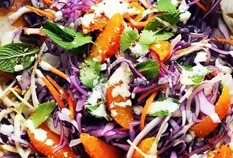 Ça loupe pas au moindre rayon je pense à tous ces aliments colorés, parfumés qui poussent… en été ! Et du coup mon envie de couleurs devient plus compliquée, beaucoup plus compliquée. Enfin avant que je me rende compte que tout ce qui pousse encore en cette fin d'hiver peut aussi produire de bien jolies couleurs et satisfaire largement mes envies…Coleslaw multicoloreIngrédients : ¼ de chou rouge – ¼ de chou blanc – ¼ d'oignon rouge – 1 petite carotte – 1 orange sanguine - 3 tiges de coriandre effeuillé – 3 tiges de menthe effeuilléePour la sauce : 3càs de yaourt nature du type à la grecque – 1càs de moutarde de Dijon – 1càs de vinaigre de cidre – 10cl d’huile de tournesol (ou d'olive si vous voulez une sauce plus parfumée) – ¼ de càc de zaatar - sel et poivreEmincez finement les deux choux, rouge et blanc, l'oignon, si vous avez une mandoline c'est mieux mais avec un couteau et de l'attention pour faire fin fin c'est bien aussi. Taillez la carotte en fines tranches puis en filaments.Mélangez tous les légumes dans un saladier.Prélevez les suprêmes des oranges. Il faut donc commencer par les éplucher, enlever la peau blanche qui les entoure, puis prélever les quartiers en enlevant toute la peau blanche aussi sur chacun. Il ne doit rester que la chair des oranges.Réservez les suprêmes sur une assiette.Préparez la sauce en mélangeant tous les ingrédients dans un bol et en fouettant le tout jusqu'à obtenir une sauce bien onctueuse.Versez la sauce sur les légumes et mélangez bien. Répartissez les suprêmes d'orange puis terminez en parsemant les feuilles de menthe et de coriandre par dessus et en saupoudrant de quelques pincées de zaatar.