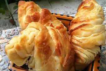 Diviser chaque boules en huit petites boules et étaler les disques, badigeonner chaque disque avec du beurre mou et mettre chaque disque par dessus l’autre jusqu’à épuisement .