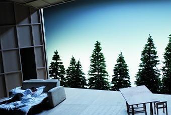L'espace scénique est uniquement composé d'une énorme boîte en bois clair, un parallélépipède à la perspective accentuée qui ouvre sur le grenier montrant une forêt imaginaire où est réfugié le canard sauvage. Le plancher s'incline lorsqu'Hjalmar découvre la vérité qui jette le trouble sur sa vie familiale. Le sol incliné oblige les acteurs à un déplacement déséquilibré, symbole de leur vie chamboulée.