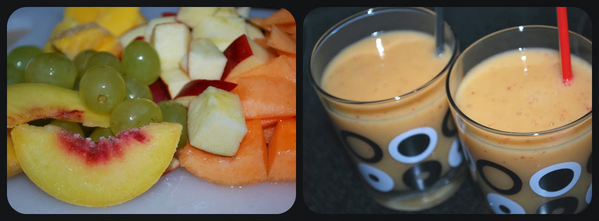 - 1/2 tasse de pêches surgelées- 1/2 tasse de mangues surgelées- 1/2 tasse de cantaloup frais- 1 pomme rouge coupée en dés- quelques raisins verts- 1 tasse de lait noix de coco et amandes non sucré (ou lait d'amandes simplement)