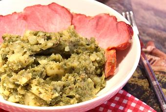 Au bout d'une heure, retirez la palette fumée et coupez-la en tranches. Ecrasez grossièrement le chou et les pommes de terre à l'aide d'un presse-purée, salez légèrement et poivrez.
