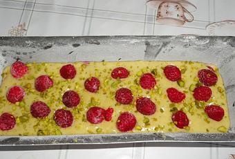 Parsemer avec la moitié des framboises . Recouvrir du reste de pâte et parsemer le restant de framboises et quelques pistaches concassées.