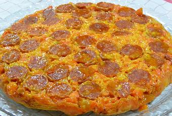 POser sur un plat à tarte beurré, le chorizo puis les carottes à la crème puis le camembert coupé en morceaux.