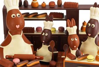 Des lapins toqués, habillés et coiffés sur mesure, des pâtisseries démesurées, des éclairs au chocolat et religieuses taillés dans la démesure, des ustensiles en chocolat…
