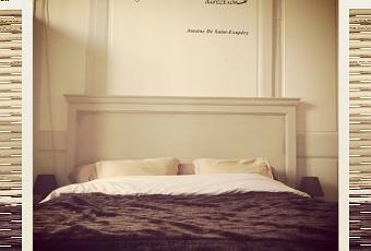 Je ne savais que faire de ce grand espace blanc (décidément, c’est une obsession!) au-dessus de notre lit. Toujours dans l’esprit « bobo littéraire » que nous voulons insuffler à notre appartement, nous avons opté pour cette citation de Saint-Exupéry qui colle parfaitement à l’ambiance.