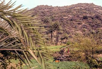 Rochers, palmiers, femmes au travail, irrigation antique, un peu comme au Maroc.