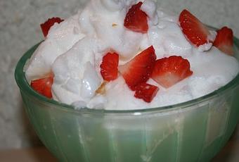 Couper les fraises et les répartir dans 6 coupes à desserts, verser la creme, garnir avec blanc oeuf en neige et reserver au frais jusqu'au dessert
